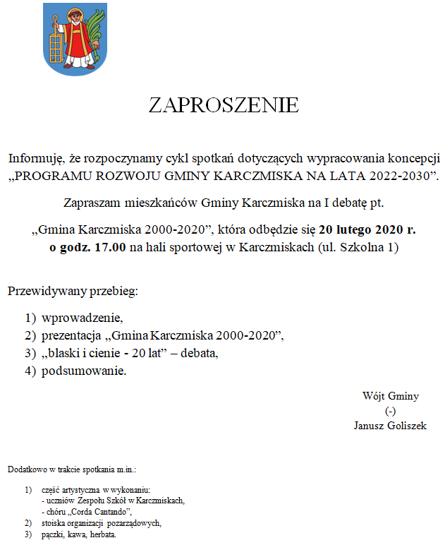 W dniu 20 lutego 2020 r. na hali sportowej w Karczmiskach Pierwszych (ul. Szkolna 1) odbyła się I debata dotycząca wypracowania nowej koncepcji Programu Rozwoju Gminy Karczmiska na nowy okres programowania środków z UE. Na hali sportowej zgromadziła się licznie społeczność lokalna Gminy w tym m.in.: władze samorządowe radni gminni i powiatowi z terenu Gminy, sołtysi, pracownicy jednostek organizacyjnych podległych Gminie, przedsiębiorcy, przedstawiciele organizacji pozarządowych i społecznych, młodzież szkolna ci mieszkańcy.