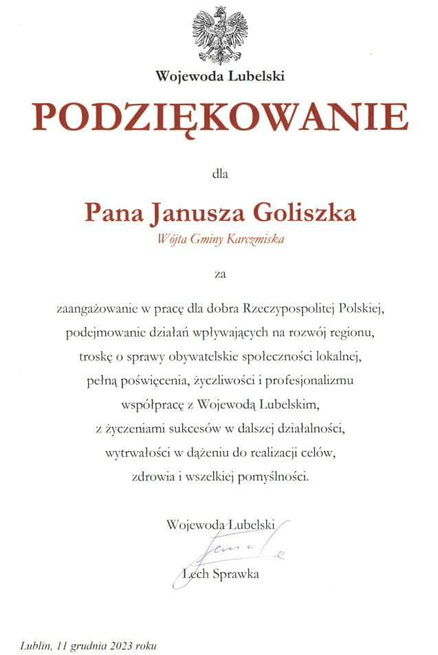 Bardzo proszę Mieszkańców miejscowości: Uściąż, Mieczysławka, Górki, Chodlik, Głusko Duże Kolonia (Solec), Zaborze, Karczmiska Drugie: ul. Wesoła, ul. Wygon, ul. Plebanka Karczmiska Pierwsze Kolonia: ul. Sadowa, ul Kolejowa o uzbrojenie się cierpliwość w sprawie budowy drogi asfaltowej. Umowa została podpisana. Wykonawca ma czas na wykonanie wszystkich 11 dróg do czerwca 2024 roku. Roboty zostaną rozpoczęte w tym roku na drodze w Uściążu. Prace na pozostałych drogach, w zależności od pogody (wchodzimy w okres zimowy), mogą być kontynuowane dopiero na wiosnę 2024 roku. Łączna wartość prac wynosi 7 294 249,16 zł. Dofinansowanie z Polskiego Ładu wynosi 4 987 500,00 zł + budżet Gminy Karczmiska 2 306 749,16 zł.