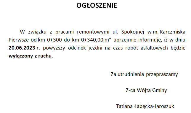 Pragnę poinformować, iż w dniu 4 sierpnia 2023 roku podpisaliśmy umowę z P.P.H.U RAFDAN Spółka z o.o. z Kurowa na wykonanie remontu i modernizacji dróg na terenie Gminy Karczmiska w ramach programu Polski Ład. Remont dotyczy następujących dróg: ul. Sadowa, ul. Kolejowa w m. Karczmiska Pierwsze, ul. Plebanka, ul. Wygon, ul. Wesoła w m. Karczmiska Drugie, droga gminna w miejscowości: Uściąż, Mieczysławka, Zaborze, Chodlik, Głusko Duże Kolonia, Górki. Łączna kwota umowy wynosi7,3 mln zł. Dofinansowanie z Programu Rządowego „Polski Ład” wynosi 4,9 mln zł.