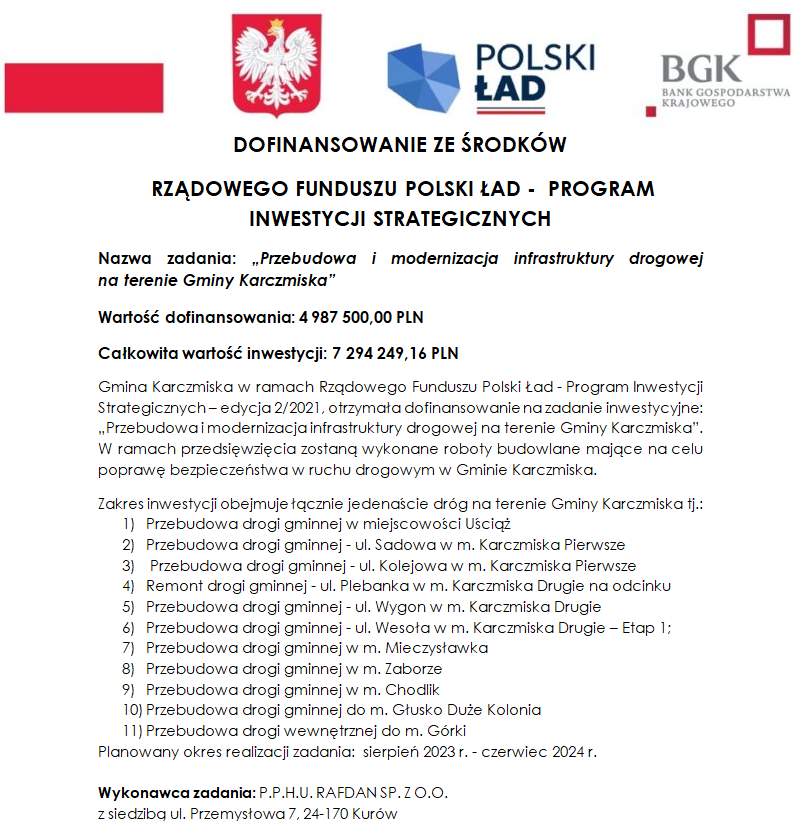 w wysokości 1 099 643,00 zł na realizację przedsięwzięcia pn. „Przebudowa drogi gminnej nr 113494L w zakresie budowy chodnika z wjazdami od km 0+990 do km 2+525- ul. Starowiejska w m. Karczmiska Drugie”. Przyznane wsparcie finansowe stanowi 95 % przewidywanej wartości robót budowlanych.