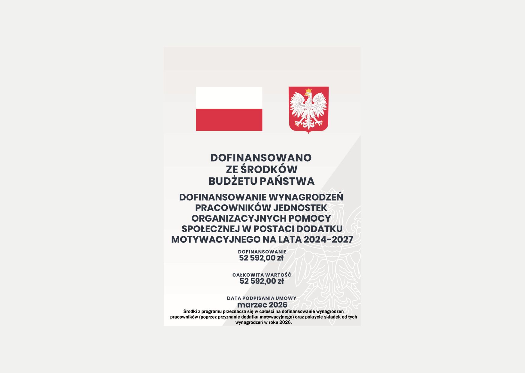 W marcu 2026 r. została podpisana umowa w zakresie „Dofinansowania wynagrodzeń pracowników jednostek organizacyjnych pomocy społecznej w postaci dodatku motywacyjnego na lata 2024-2027″