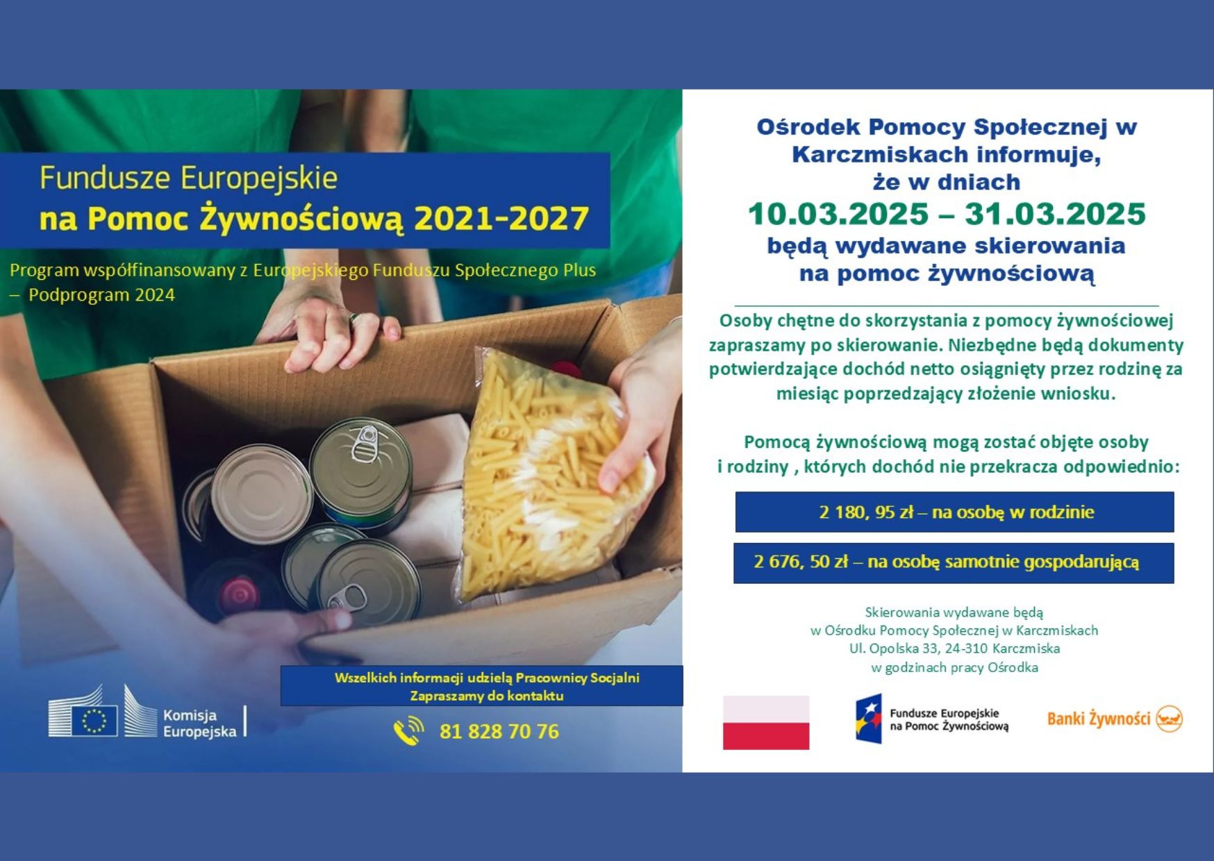Fundusze Europejskie na Pomoc Żywnościową Opublikowano w dniu 12 marca 2025 Autor: Agnieszka Skrzyńska-Michalczewska Drodzy Mieszkańcy, Ośrodek Pomocy Społecznej w Karczmiskach informuje, że w dniach 10 – 31 marca 2025 r. będą wydawane skierowania na pomoc żywnościową. FacebookXEmail
