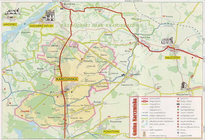 Gmina Karczmiska położona jest w południowo-zachodniej części województwa lubelskiego, w powiecie Opole Lubelskie. Gmina sąsiaduje z gminami Wąwolnica, Poniatowa, Kazimierz Dolny. Większość gminy leży w granicach Kazimierskiego Parku Krajobrazowego i jego strefy ochronnej oraz w tzw. „Trójkącie Turystycznym Kazimierz-Puławy- Nałęczów”.