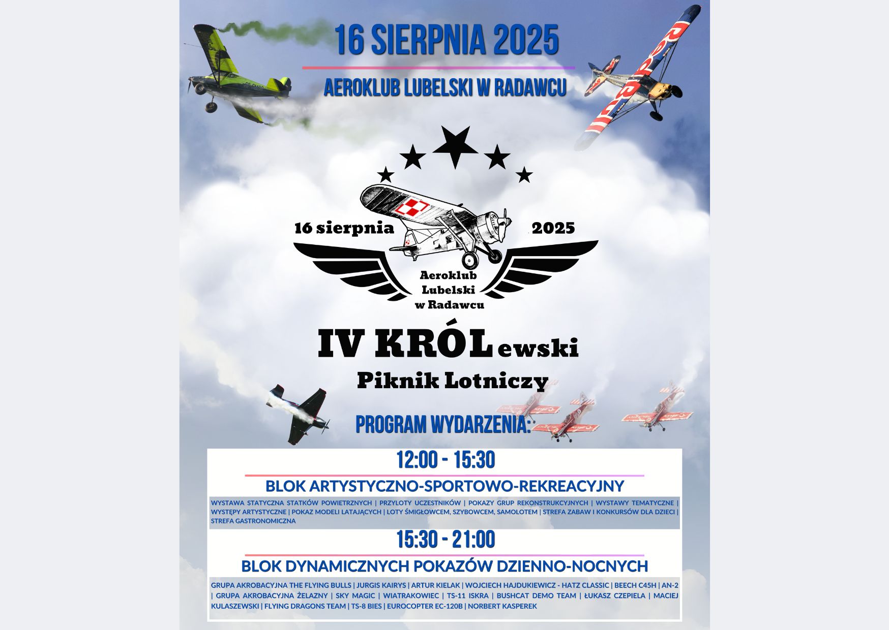 16 sierpnia 2025 roku na terenie Aeroklubu Lubelskiego w Radawcu, w godz. 12:00-21:00 odbędzie się IV KRÓLewski Piknik Lotniczy. Jest to wyjątkowe wydarzenie łączące pokazy lotnicze z edukacją i wychowaniem patriotycznym.