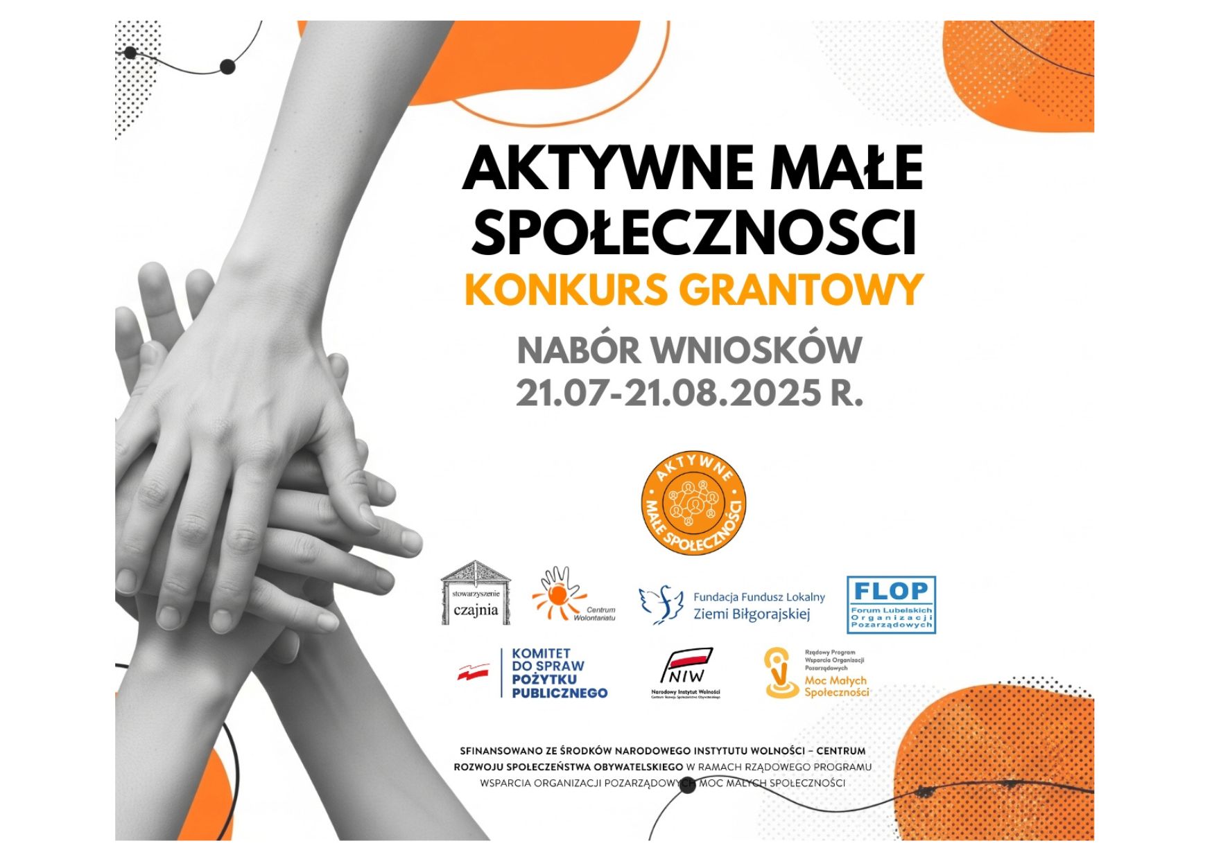 Wystartował kolejny konkurs grantowy dla małych i średnich lokalnych organizacji pozarządowych z województwa lubelskiego oraz grup nieformalnych finansowany przez Narodowy Instytut Wolności- Centrum Rozwoju Społeczeństwa Obywatelskiego. Konkurs Aktywne Małe Społeczności realizowany jest w ramach programu Moc Małych Społeczności przez grupę partnerską Stowarzyszenie „Czajnia”, Fundację Fundusz Lokalny Ziemi Biłgorajskiej, Stowarzyszenie Centrum Wolontariatu w Lublinie oraz Związek Stowarzyszeń Forum Lubelskich Organizacji Pozarządowych.