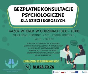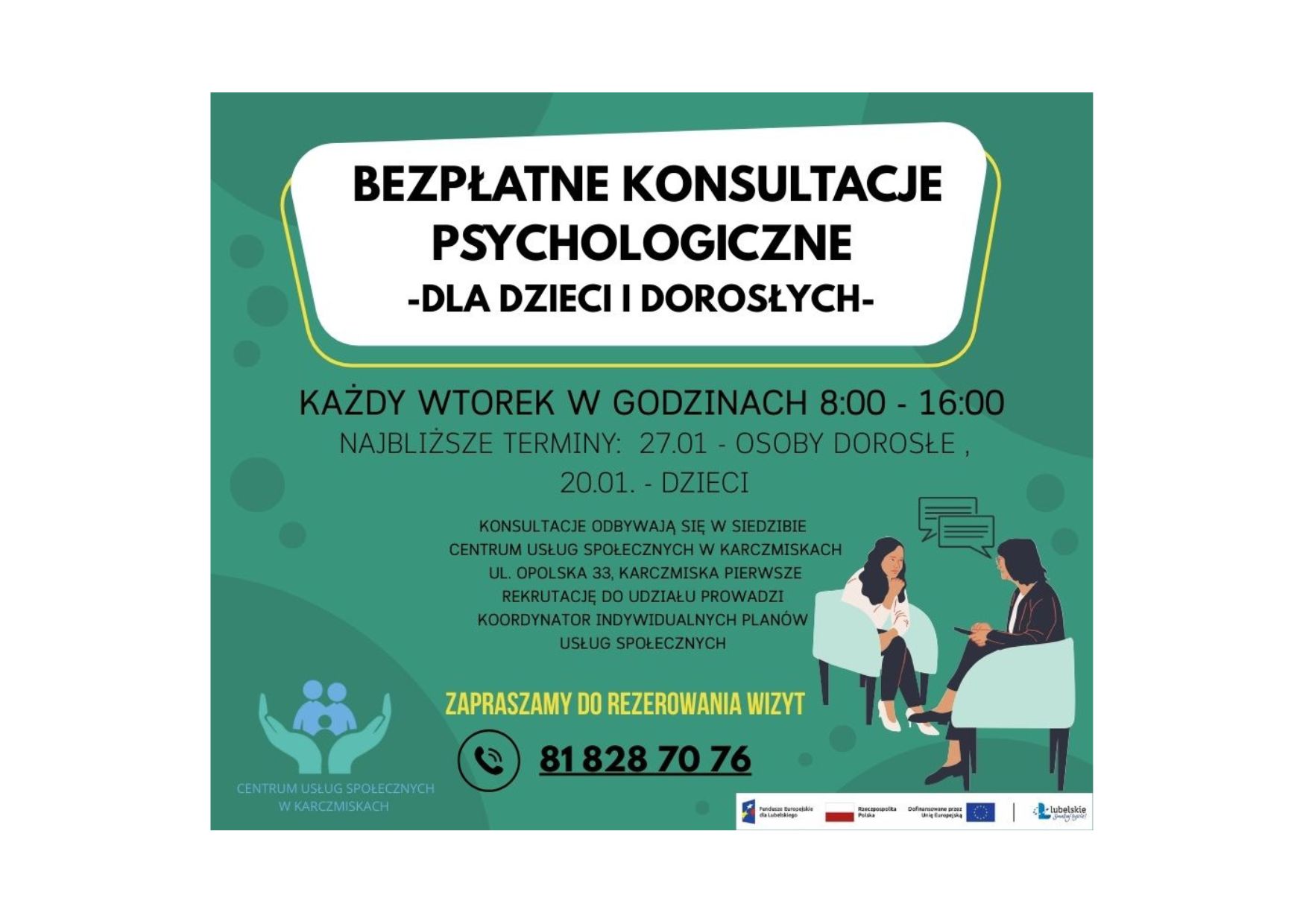 Centrum Usług Społecznych w Karczmiskach zaprasza do skorzystania z bezpłatnych konsultacji psychologicznych dla dzieci, młodzieży i dorosłych.