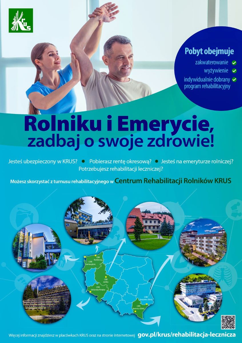 KRUS gorąco zachęca rolników do korzystania z turnusów rehabilitacji leczniczej w Centrum Rehabilitacji Rolników KRUS oraz wzięcia udziału w ogólnokrajowym konkursie „Bezpieczne Gospodarstwo Rolne” czy konkursie dla dzieci „Wioski Bez Troski”.