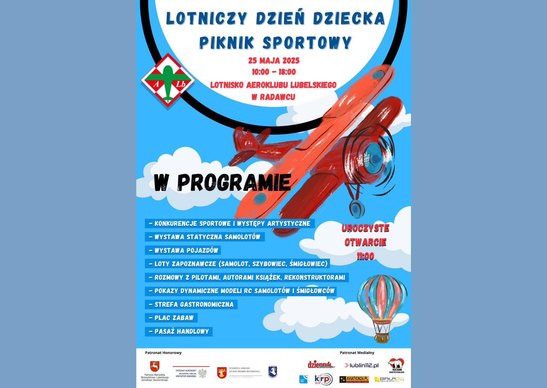 Wydarzenie to jest wyjątkową okazją do rodzinnego spędzenia czasu w otoczeniu lotniczych atrakcji – w programie przewidziane m.in. loty zapoznawcze, możliwość zapoznania się z działalnością Aeroklubu, strefy zabaw dla dzieci, konkursy oraz inne niespodzianki.