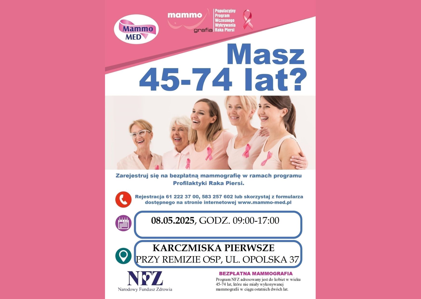 w czwartek 8 maja 2025 r. w godzinach 9.00 – 17.00 w Karczmiskach na parkingu przy OSP (ul. Opolska 37) pojawi się mammobus. Mammografia jest bezpłatna, trzeba się jednak wcześniej zarejestrować: nr tel.: 583 257 602, 583 257 605.