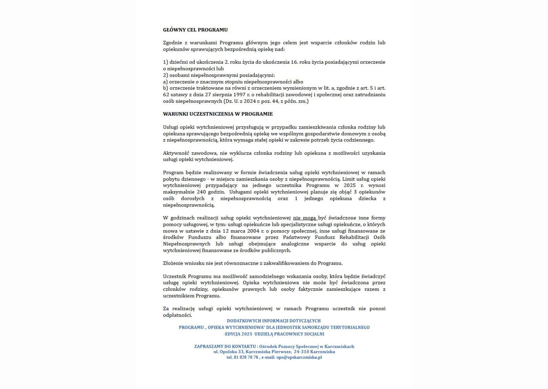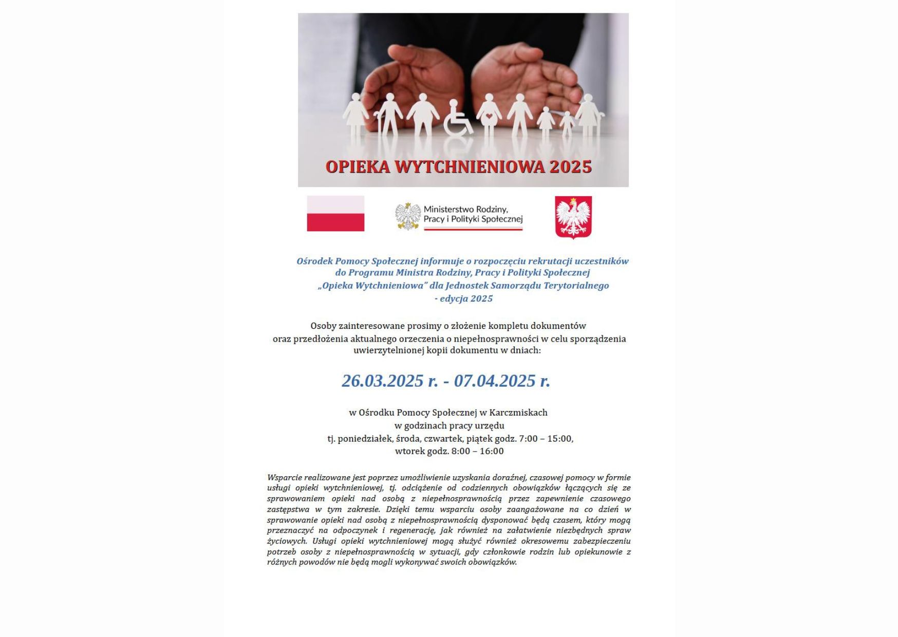 Ośrodek Pomocy Społecznej w Karczmiskach zaprasza osoby zainteresowane uczestnictwem w Programie ” Opieka Wytchnieniowa” dla Jednostek Samorządu Terytorialnego – edycja 2025 do składania wniosków.