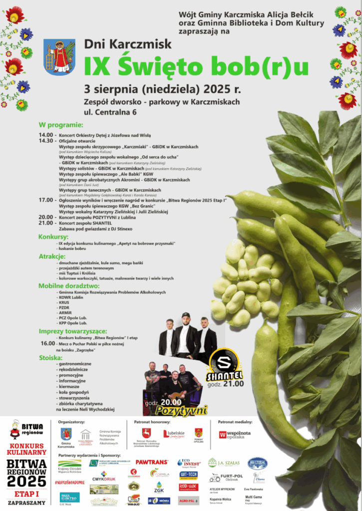 Dosłownie kilka dni dzieli nas od tegorocznego Święta Bob(r)u! Wydarzenie rozpocznie się w niedzielę 3 sierpnia o 14.00. W programie m.in. konkurs kulinarny „Bitwa Regionów” Etap I, występy lokalnych artystów, stoiska gastronomiczne, rękodzielnicze i promocyjne oraz liczne atrakcje dla dzieci. Gwiazdami wieczoru będą zespoły „Pozytyvni” oraz „Shantel”.