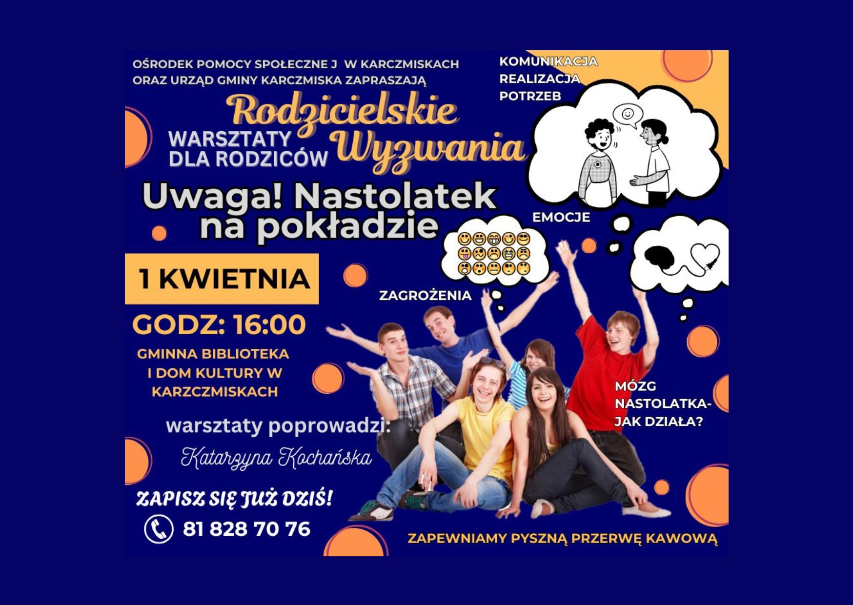 Ośrodek Pomocy Społecznej w Karczmiskach zaprasza na kolejne warsztaty z cyklu „Rodzicielskie wyzwania”. Tym razem tematem przewodnim spotkania będzie piękny, ale i burzliwy wiek nastoletni.