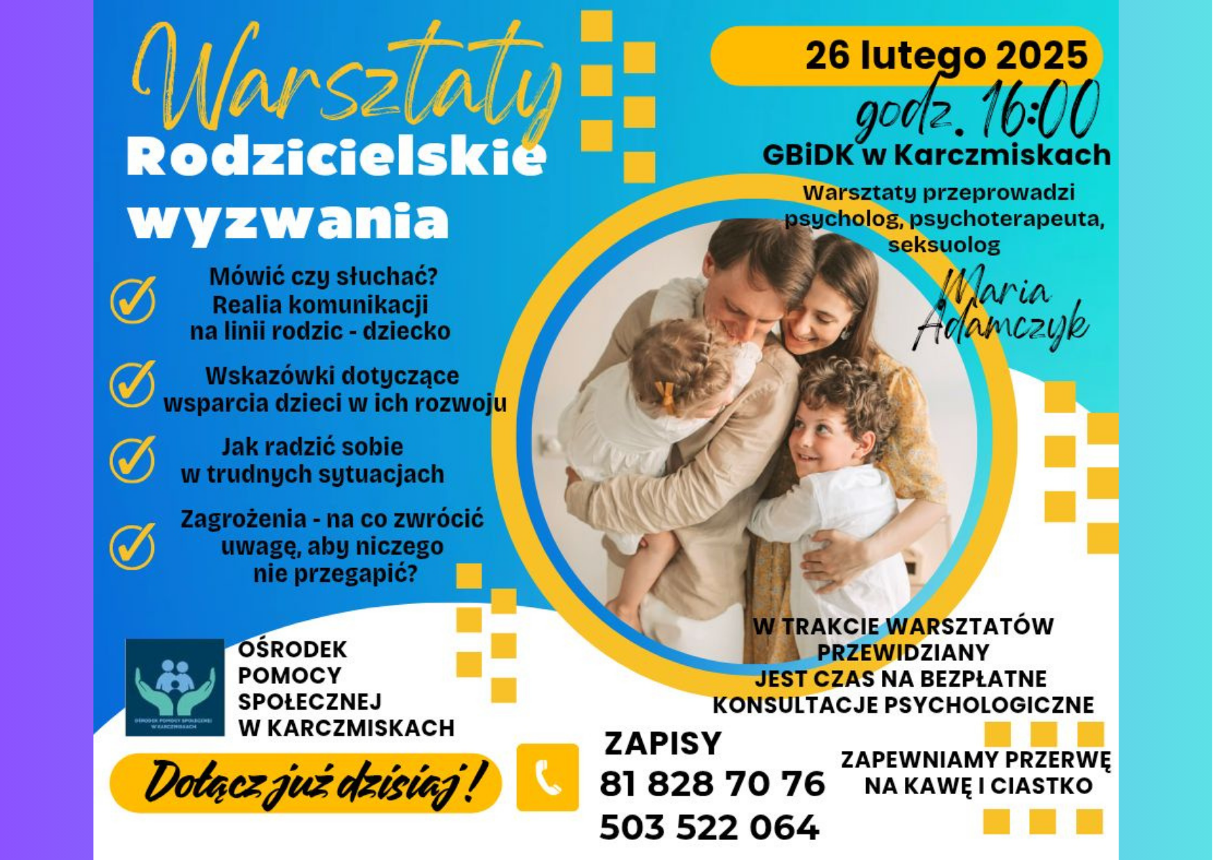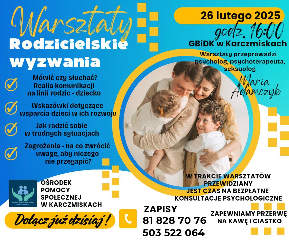 Ośrodek Pomocy Społecznej w Karczmiskach zaprasza do udziału w Warsztatach „Rodzicielskie Wyzwania”, które odbędą się 26 lutego 2025 roku o godzinie 16:00 w Gminnej Bibliotece i Domu Kultury w Karczmiskach.